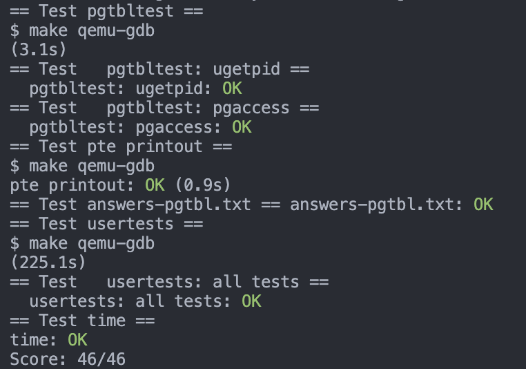 用户态是不能直接读取内核态的数据,而是要通过系统调用。如果创建一个可读 PTE 指向一块内存,该 PTE 是用户态和内核态共享的,那么用户态就可以直接读取这块内核数据,而无需经过复杂的系统调用。为每一个进程多分配一个虚拟地址位于 USYSCALL 的页,然后这个页的开头保存一个 usyscall 结构体,结构体中存放这个进程的 pid。