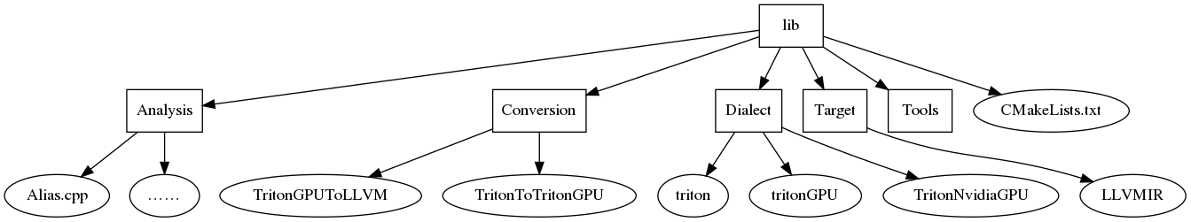 Analysis:用于进行相关分析Conversion:负责不同dialect之间的转换Dialect:各级中间表示(IR)的定义及优化pass,包含Gluon、Triton、Triton-GPU、TritonInstrument、TritonNvidiaGPUTarget:将LLVM-dialect降级到LLVM-IR,并链接外部数学库Tools:包含一些辅助工具的头文件,用于分析和调试生成的代码
